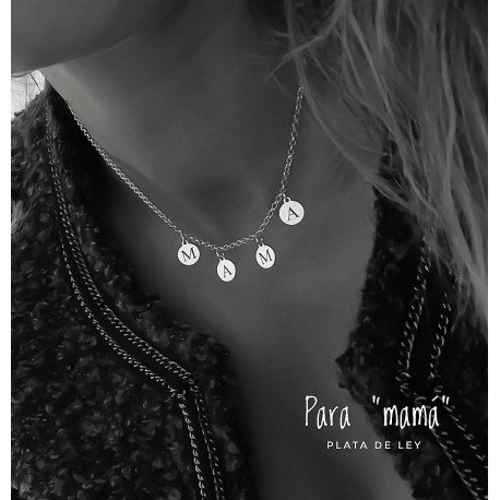 Gargantilla plata de ley 925 cadena de rolo de 42 cm largo con discos de 8mm mensaje MAMA colgando. Fabricación láser