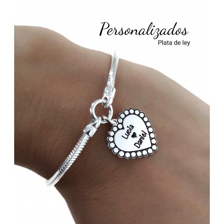 Pulsera plata de ley 925 personalizada,cadena cola de topo diamantada de 17 cm largo + cadena adaptable de 2.5 cm con motivo corazón nombres personalizados.