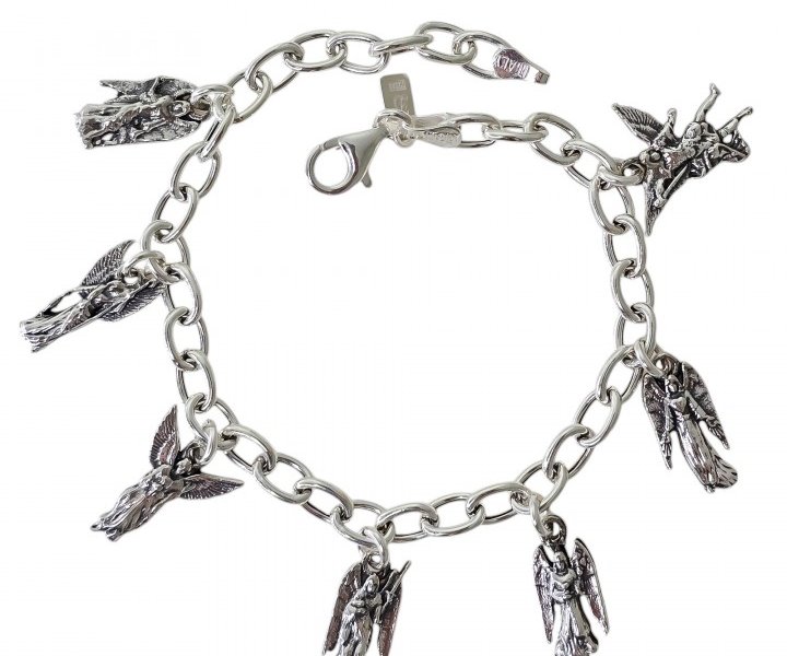 Pulsera plata de ley 925 protección divina. Pulsera asas (5mm) de 19 cm largo con los siete Arcángeles (16mm largo).