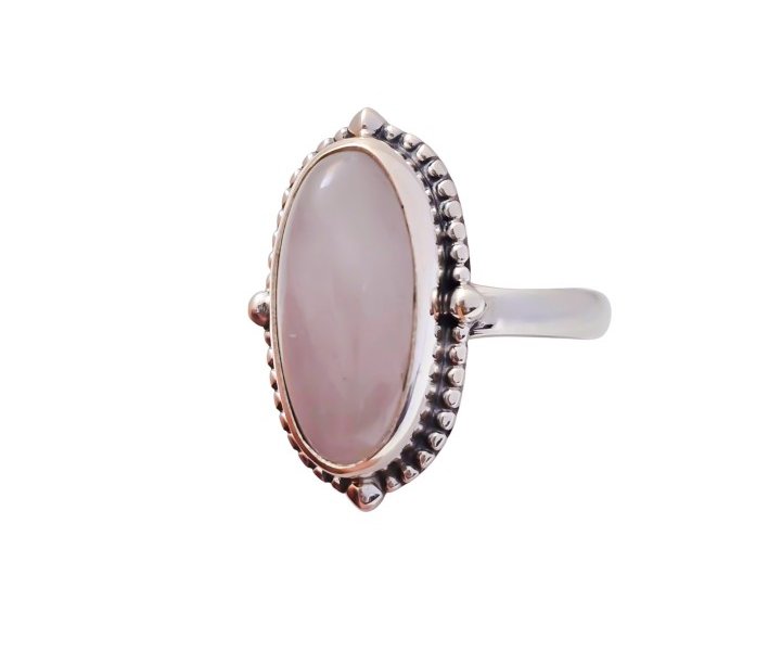 Sortija plata de ley 925 (21mm x 11mm) oxidada con piedra natural (16mm x 8mm). cuarzo rosa