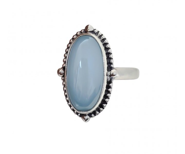 Sortija plata de ley 925 (21mm x 11mm) oxidada con piedra natural (16mm x 8mm). Calcedonia azul