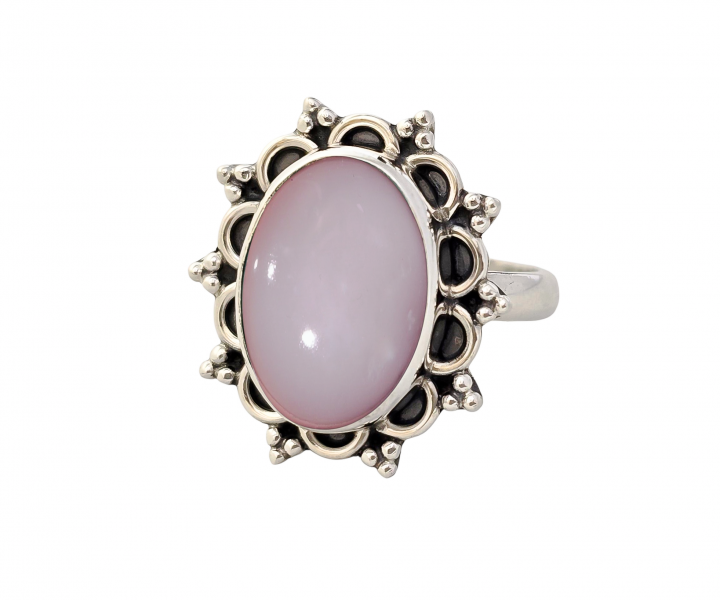 Sortija plata de ley 925 (19mm x 17mm) con dibujo oxidado y piedra natural (13mm x 9mm) Cuarzo rosa