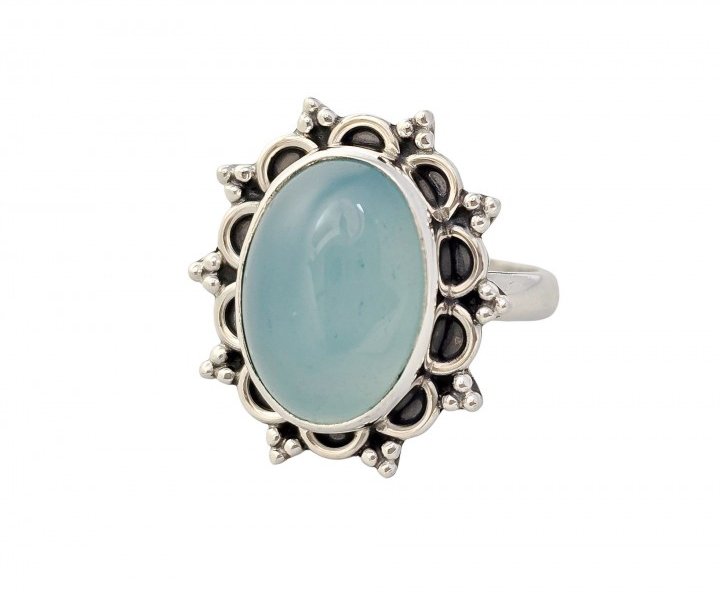 Sortija plata de ley 925 (19mm x 17mm) con dibujo oxidado y piedra natural (13mm x 9mm). Calcedonia azul