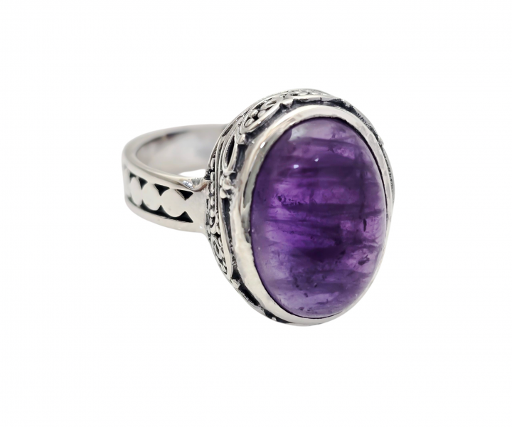 Sortija plata de ley 925 (16mm x 13mm) dibujo oxidado con piedra natural (13mm x 9mm). Amatista