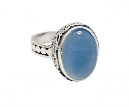 Sortija plata de ley 925 (16mm x 13mm) dibujo oxidado con piedra natural (13mm x 9mm). Calcedonia azul