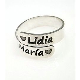 sortija en plata de ley personalizada con nombres. Los productos personalizados tienen un plazo de entrega de 20 dias habiles